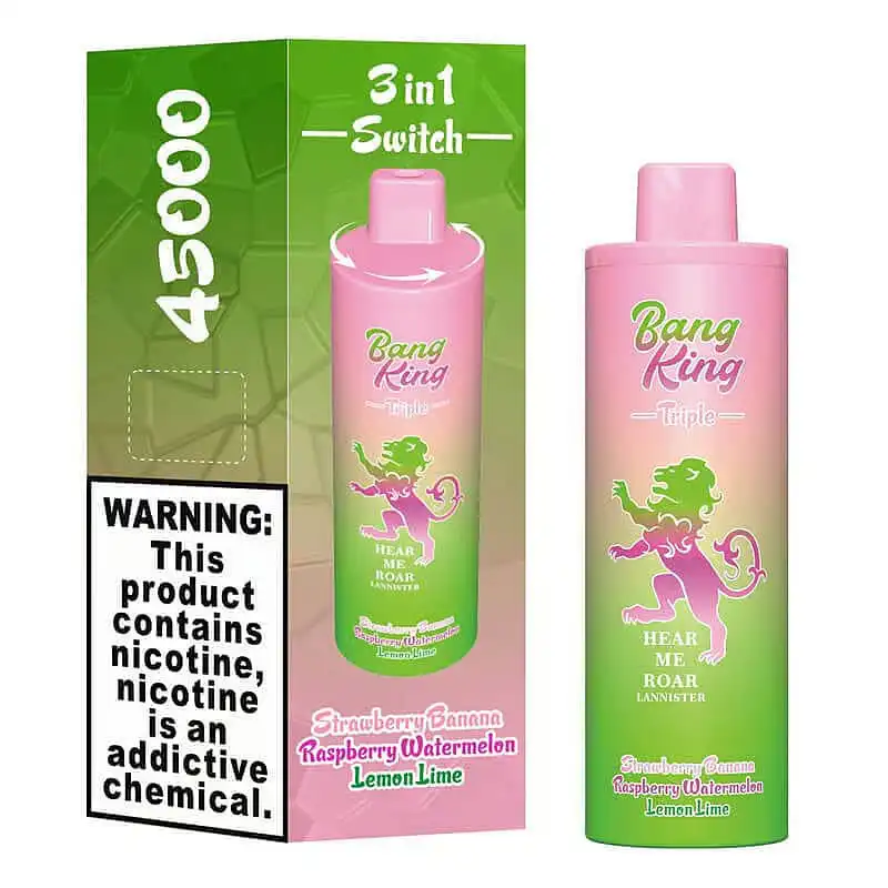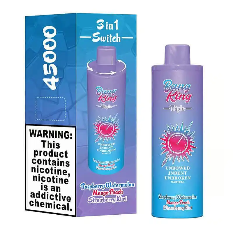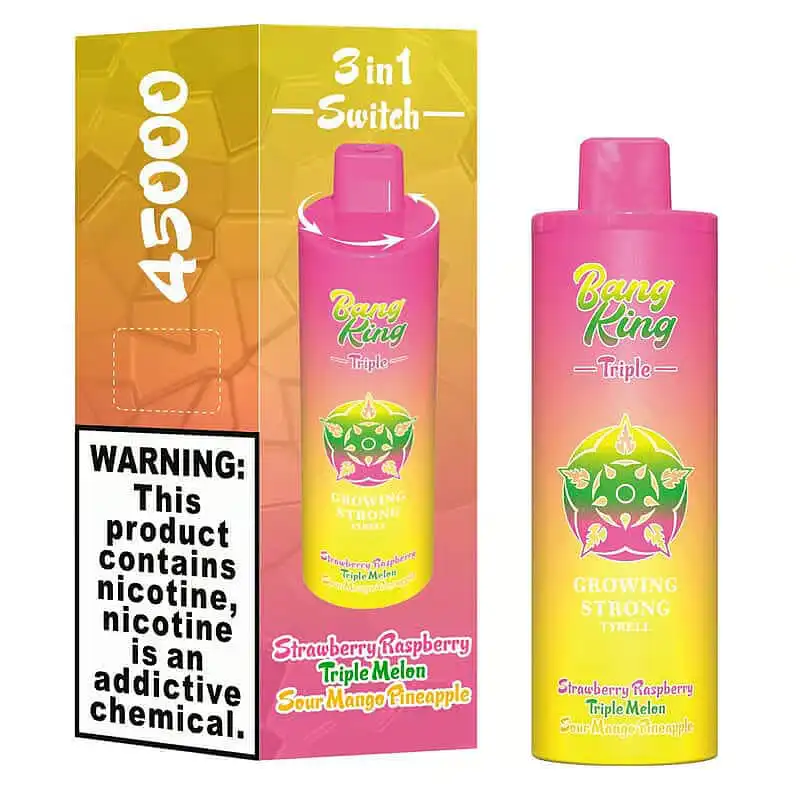 The Bang King Triple 45000 puffs vape offers three flavors, 45k puffs, 3 × 15mL e-liquid, 650mAh battery, triple 1.0Ω coils, Type-C and 10 unique flavors.