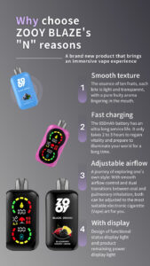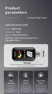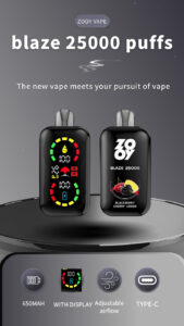 ZOOY BLAZE 25000 PUFF With its massive 25000mAh battery capacity, enjoy extended vaping sessions without worrying about frequent recharging. The sleek and ergonomic design ensures a comfortable grip, making it perfect for on-the-go vaping. The advanced airflow system guarantees smooth and satisfying clouds, while the adjustable wattage settings allow for a personalized vaping experience. Embrace the power and versatility of ZOOY Vape Blaze 25000 and indulge in a vaping journey filled with convenience, performance, and pure satisfaction.